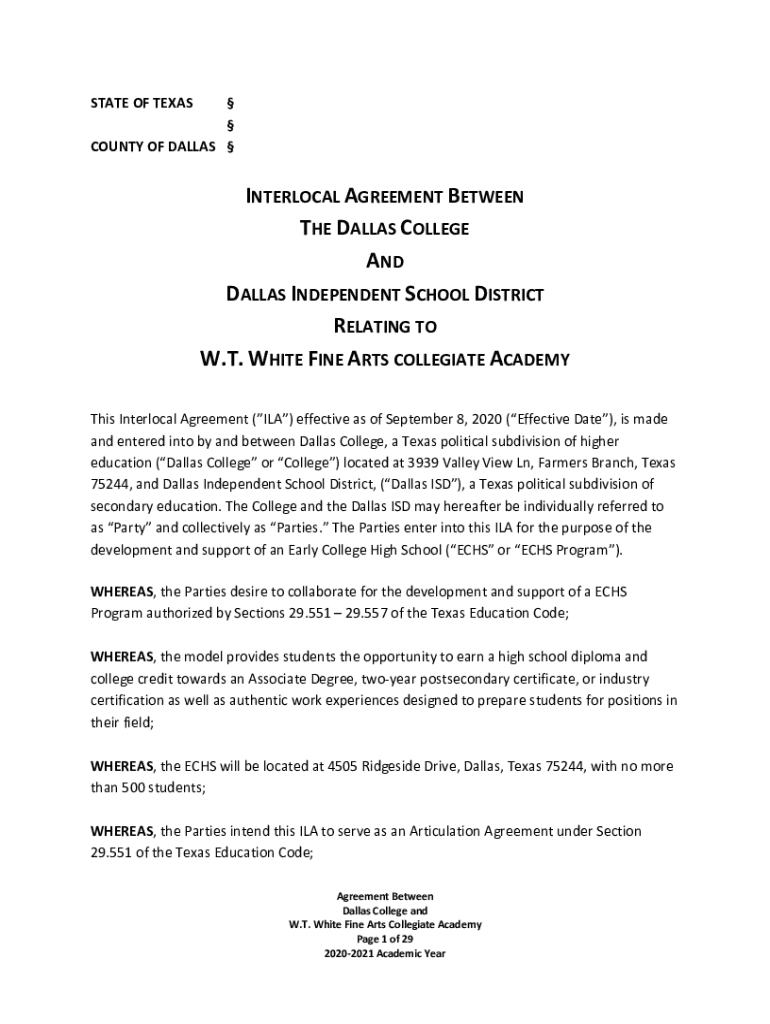 STATE OF TEXAS COUNTY OF DALLAS INTERLOCAL AGREEMENT BETWEEN THE DALLAS COLLEGE AND DALLAS INDEPENDENT SCHOOL DISTRICT RELATING TO W.T. WHITE FINE ARTS COLLEGIATE ACADEMY This Interlocal Agreement