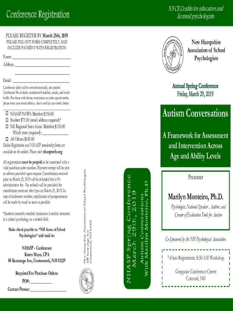 5.5 CE Credits for educators and licensed psychologistsConference Registration PLEASE REGISTER BY March 25th, 2019New Hampshire Association of School PsychologistsPLEASE FILL OUT FORM COMPLETELY AND