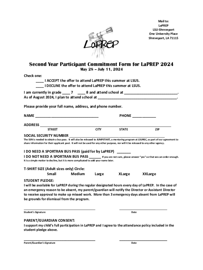 Mail to: LaPREP LSUShreveport One University Place Shreveport, LA 71115Second Year Participant Commitment Form for LaPREP 2024 May 28 July 11, 2024 Check one: ___ I ACCEPT the offer to attend LaPREP