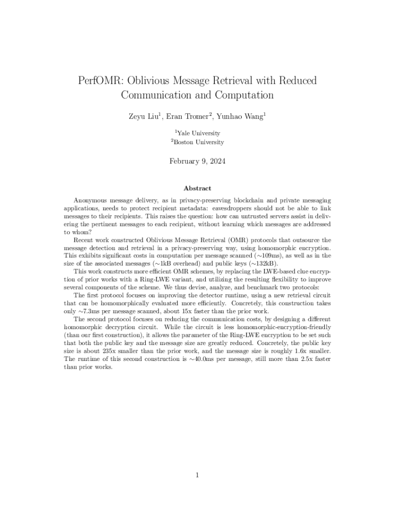 Get the free PerfOMR: Oblivious Message Retrieval with Reduced ... - eprint iacr
