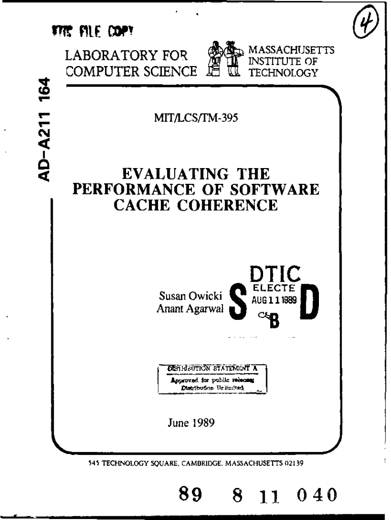 MASSACHUSETTSE OFLABORATORY FOR COMPUTER SCIENCETECHNOLOGYMIT/LCSfFM395NEVALUATING THE PERFORMANCE OF SOFTWARE CACHE COHERENCESaSusan Owicki Anant AgarwalSDTIC ELECTE AUG 111989DAppro\'red for puiblic
