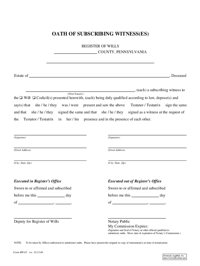 COUNTY, PENNSYLVANIAEstate of, Deceased, (each) a subscribing witness to