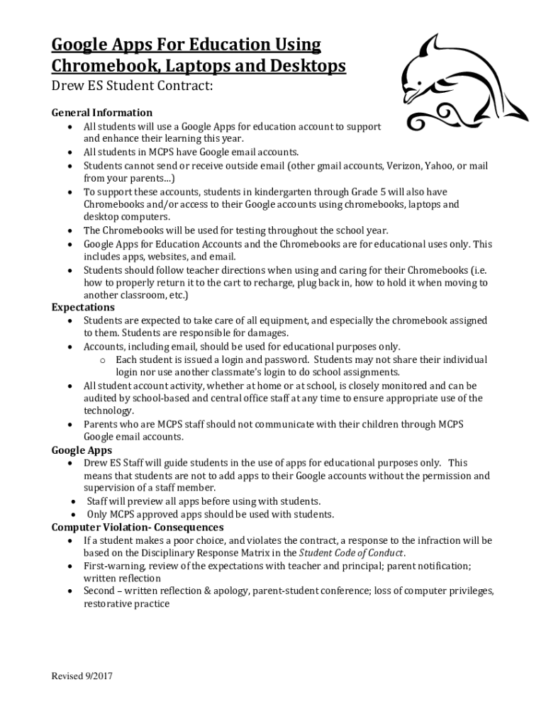 Google Apps For Education Using Chromebook, Laptops and Desktops Drew ES Student Contract: General Information All students will use a Google Apps for education account to support and enhance their