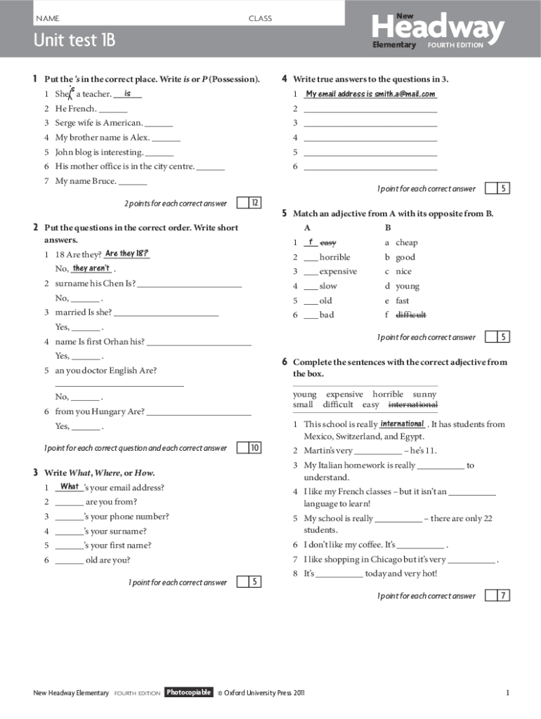 NAMEHeadway NewCLASSUnit test 1BElementary1Put the s in the correct place. Write is or P (Possession). s 1 She a teacher.isFOURTH EDITION4Write true answers to the questions in 3. 1My email address