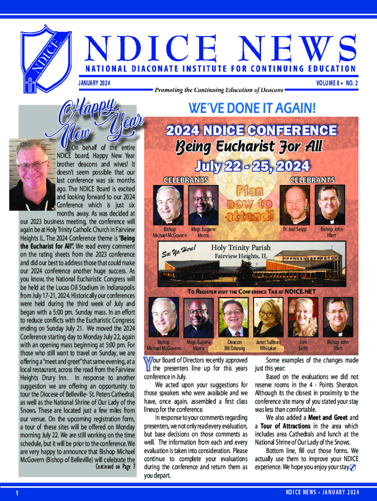 January 2024VOLUME 8 nO. 2y p p a H r a e Y w e NOn behalf of the entire NDICE board, Happy New Year brother deacons and wives! It doesnt seem possible that our last conference was six months ago.
