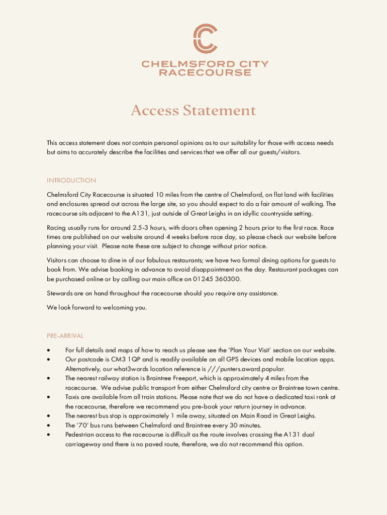 Access Statement This access statement does not contain personal opinions as to our suitability for those with access needs but aims to accurately describe the facilities and services that we offer