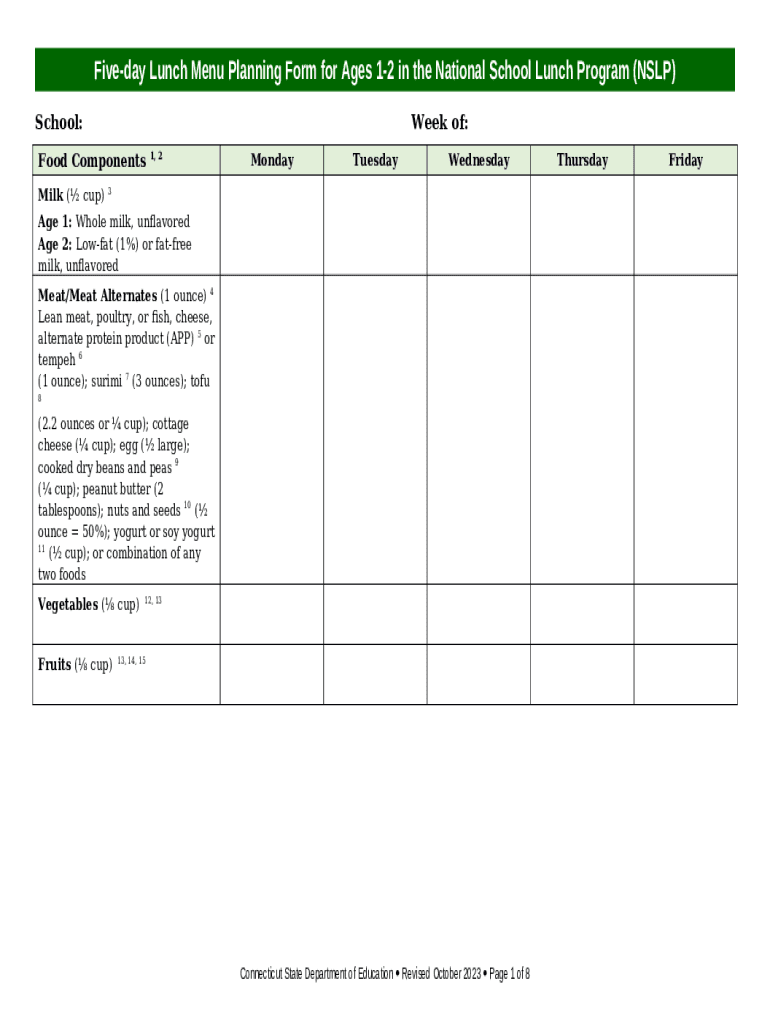 Instructions for the form Fiveday Lunch Menu Planning for Ages 1-2 in the NSLP