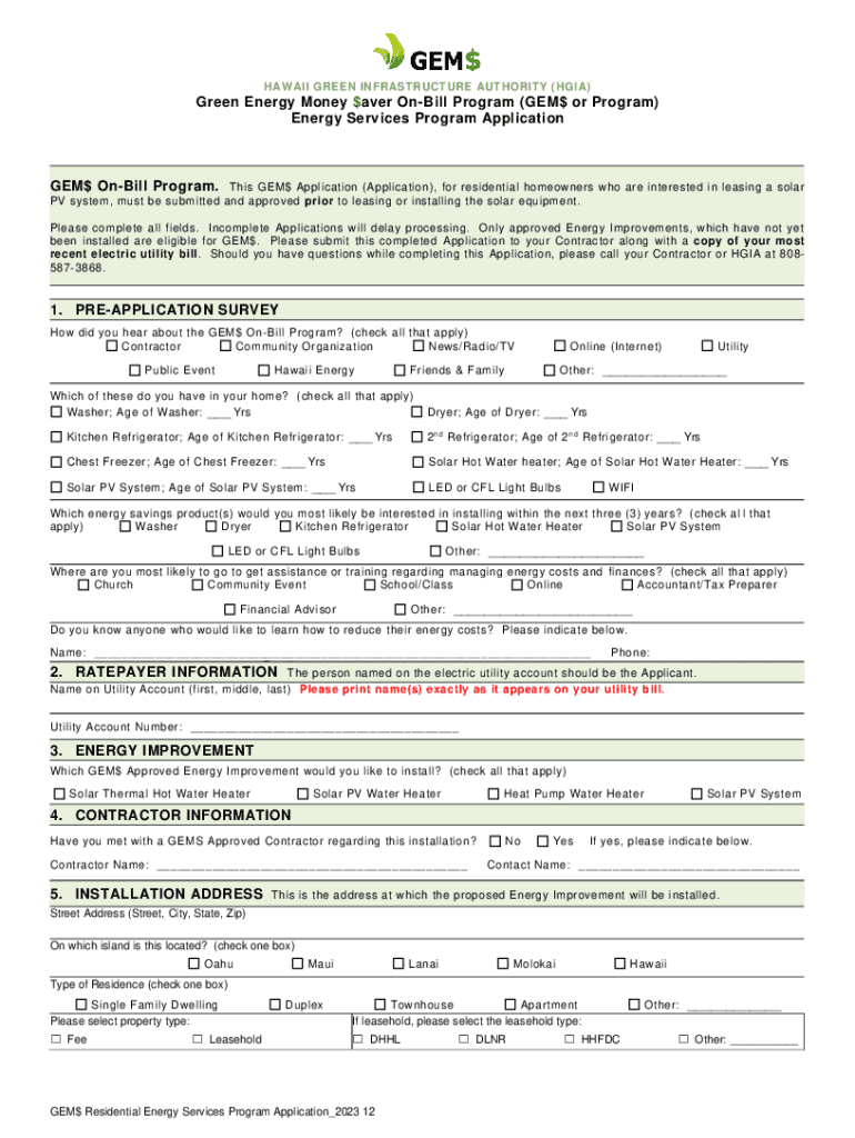 HAWAII GREEN INFRASTRUCTURE AUTHORITY (HGIA)Green Energy Money $aver OnBill Program (GEM$ or Program) Energy Services Program ApplicationGEM$ OnBill Program.This GEM$ Application (Application), for