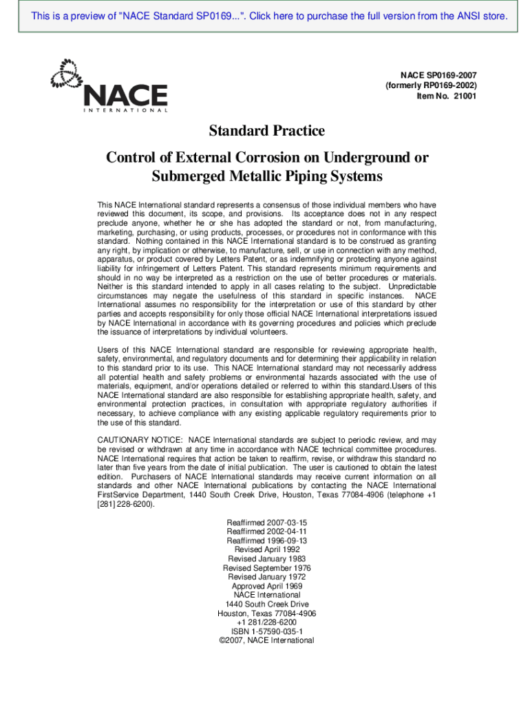 This is a preview of \”NACE Standard SP0169...\”. Click here to purchase the full version from the ANSI store.SP01692007 NACE SP01692007 (formerly RP01692002) Item No. 21001Standard Practice Control