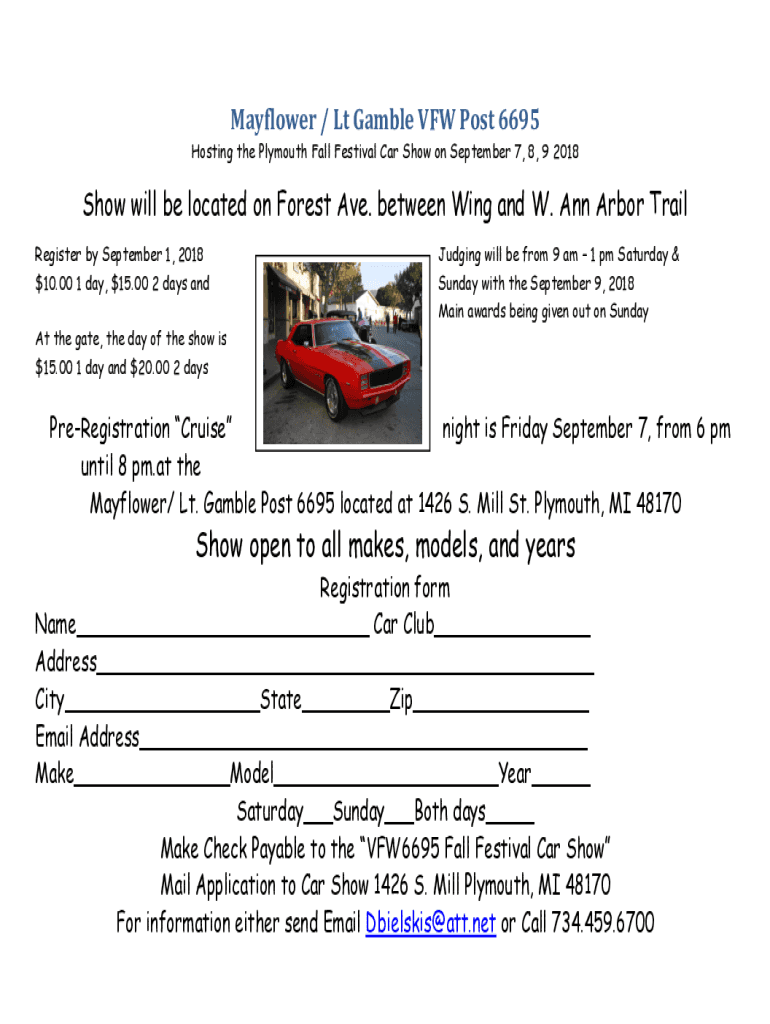 Mayflower / Lt Gamble VFW Post 6695Hosting the Plymouth Fall Festival Car Show on September 7, 8, 9 2018Show will be located on Forest Ave. between Wing and W. Ann Arbor Trail