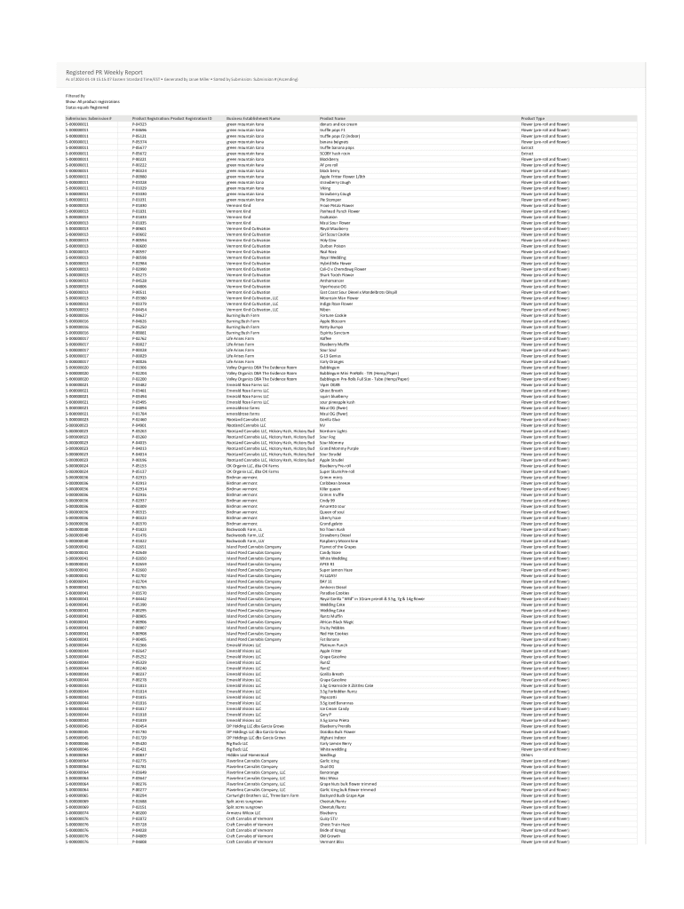 Registered PR Weekly ReportAs of 20240119 15:15:07 Eastern Standard Time/EST Generated by Janae Miller Sorted by Submission: Submission # (Ascending) Filtered By Show: All product registrations Status