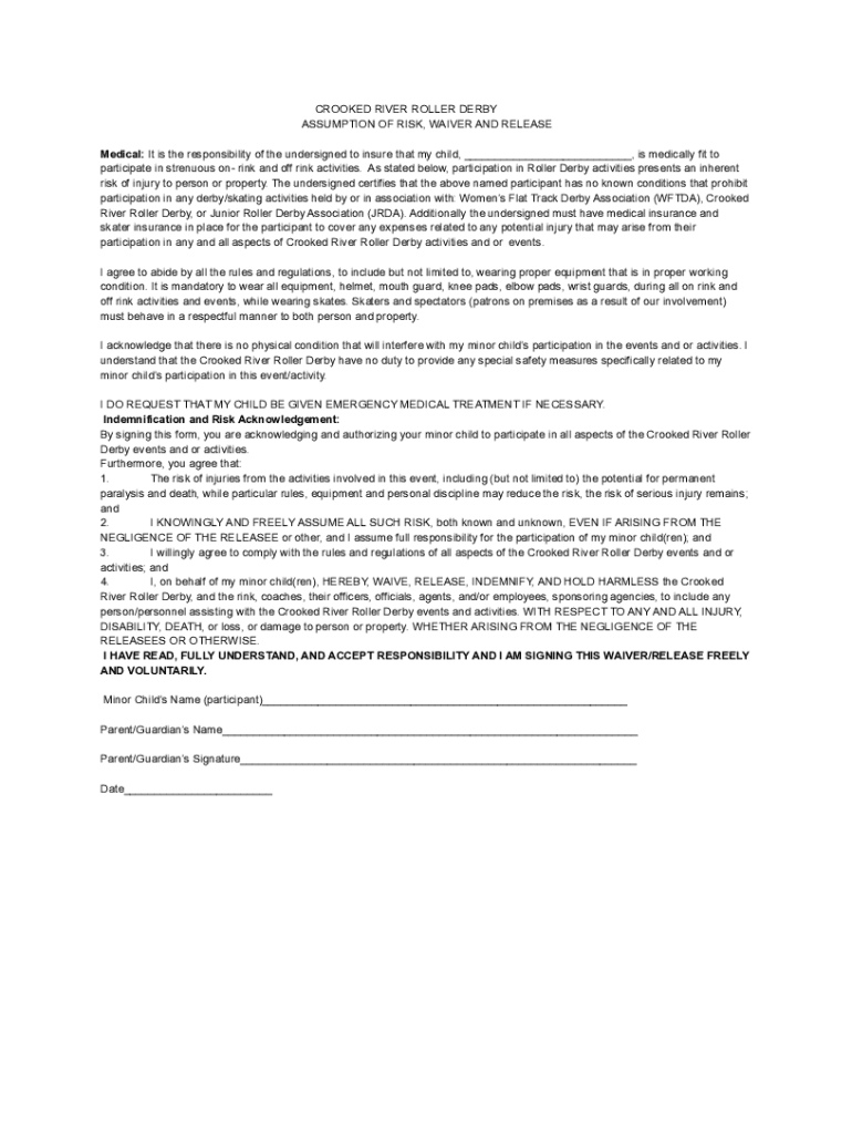 CROOKED RIVER ROLLER DERBY ASSUMPTION OF RISK, WAIVER AND RELEASE Medical: It is the responsibility of the undersigned to ensure that my child, ___, is medically fit to participate in strenuous on