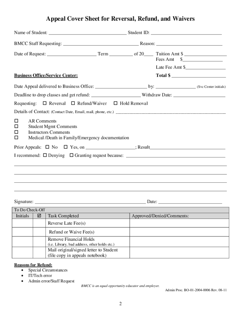 Appeal Cover Sheet for Reversal, Refund, and Waivers Name of Student: ___ Student ID: ___ BMCC Staff Requesting: ___ Reason: ___ Date of Request: ___ Term ___ of 20___ Tuition Amt $ ___ Fees Amt $___