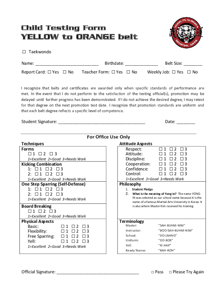 Get the free Child Testing Form - YELLOW to ORANGE belt - Taekwondo