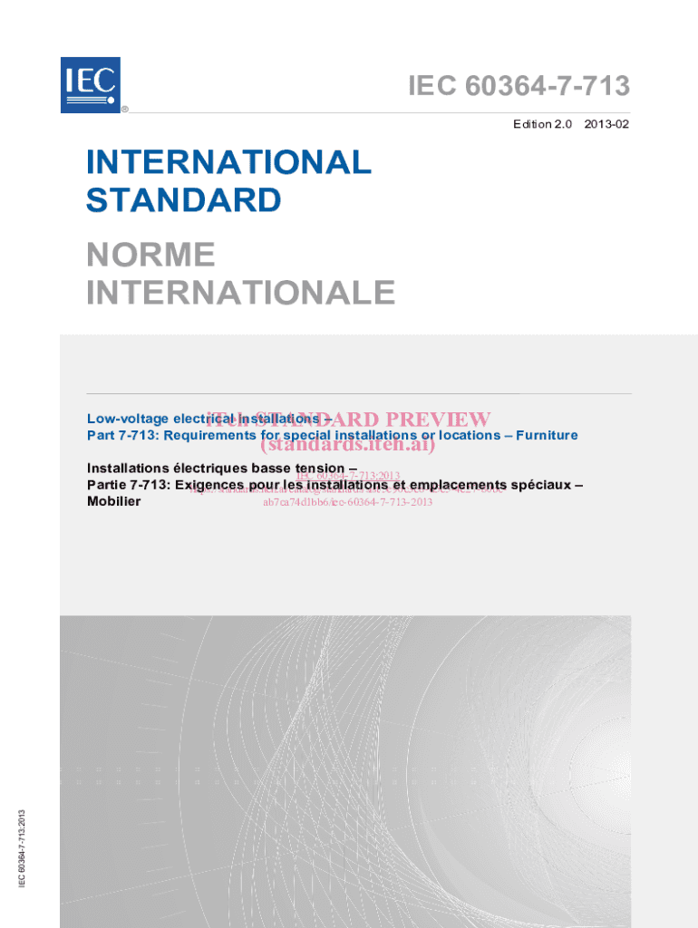 IEC 603647713Edition 2.0 201302INTERNATIONAL STANDARD NORME INTERNATIONALELowvoltage electrical installations Part 7713: Requirements for special installations or locations FurnitureiTeh STANDARD