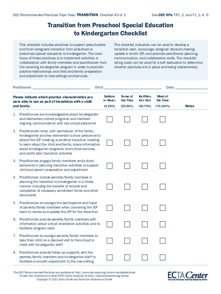 DEC Recommended Practices Topic Area: TRANSITION Checklist #3 of 3See DEC RPs: TR1, 2, and F1, 2, 4, 6Transition from Preschool Special Education to Kindergarten Checklist This checklist includes