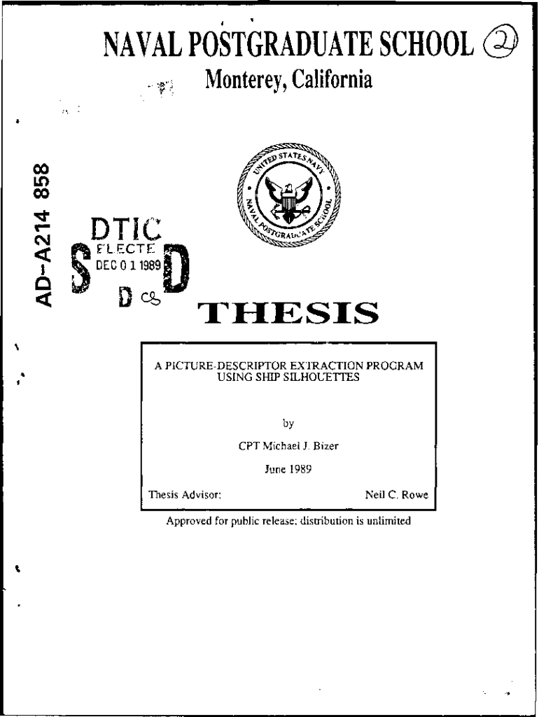 NAVAL POSTGRADUATE SCHOOL Monterey, California00 00DTIC FECTE0DEC 0 11989TIESIS A PICTUREDESCRIPTOR EXTRACTION PROGRAMUSING SHIP SILHOUETTESby CPT Michael J. Bizer June 1989 Thesis Advisor:Neil C.