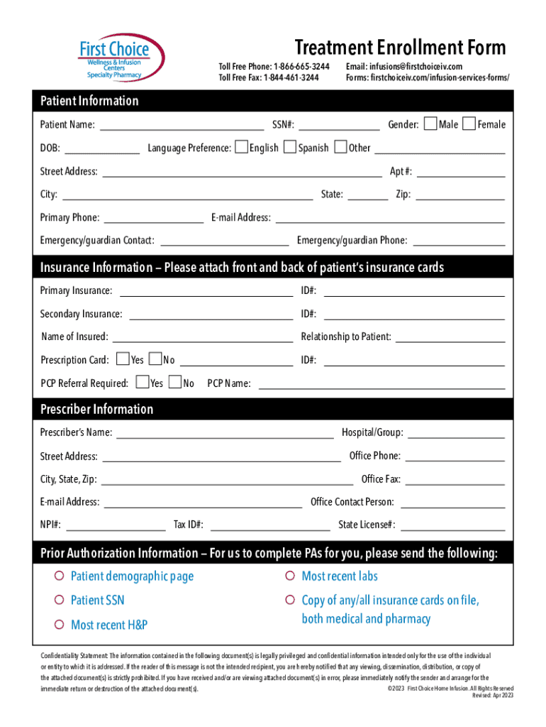 Treatment Enrollment FormToll Free Phone: 18666653244 Toll Free Fax: 18444613244Email: infusions@firstchoiceiv.com Forms: firstchoiceiv.com/infusionservicesforms/Patient Information Patient Name:SSN#:DOB:Language