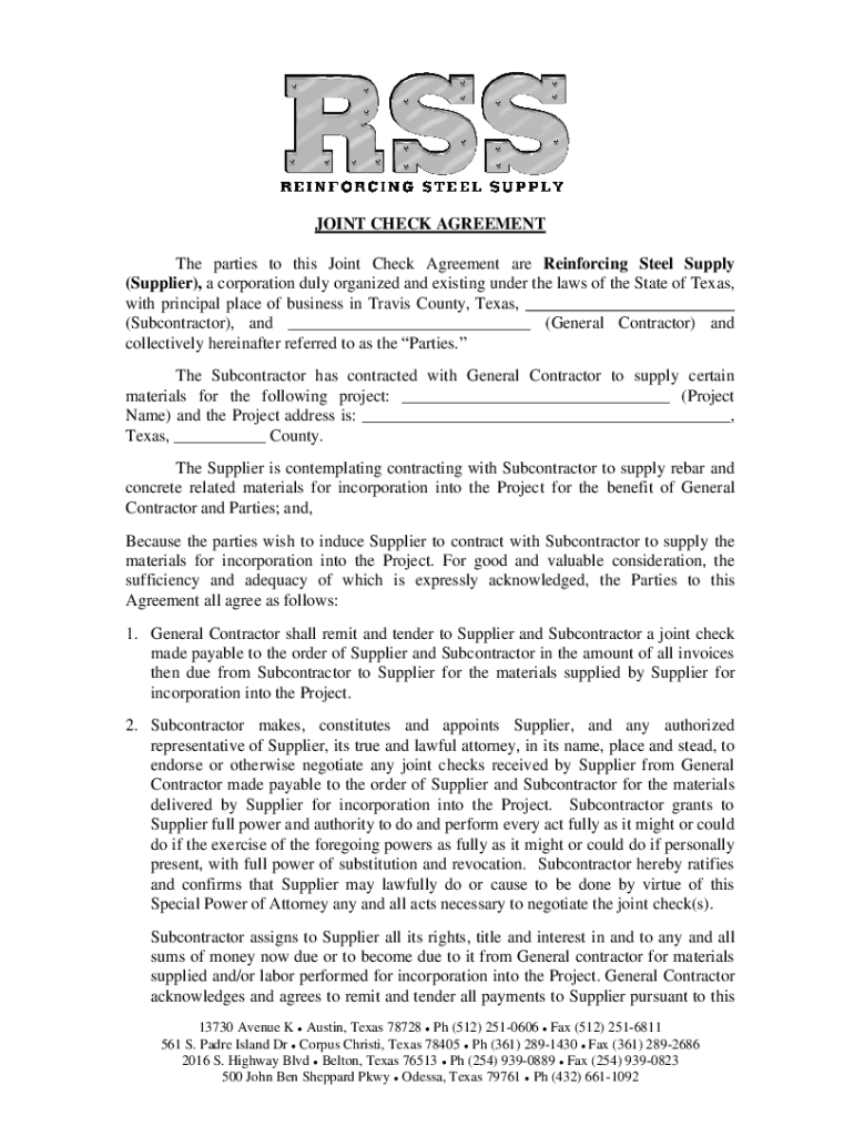 The parties to this Joint Check Agreement are Reinforcing Steel Supply