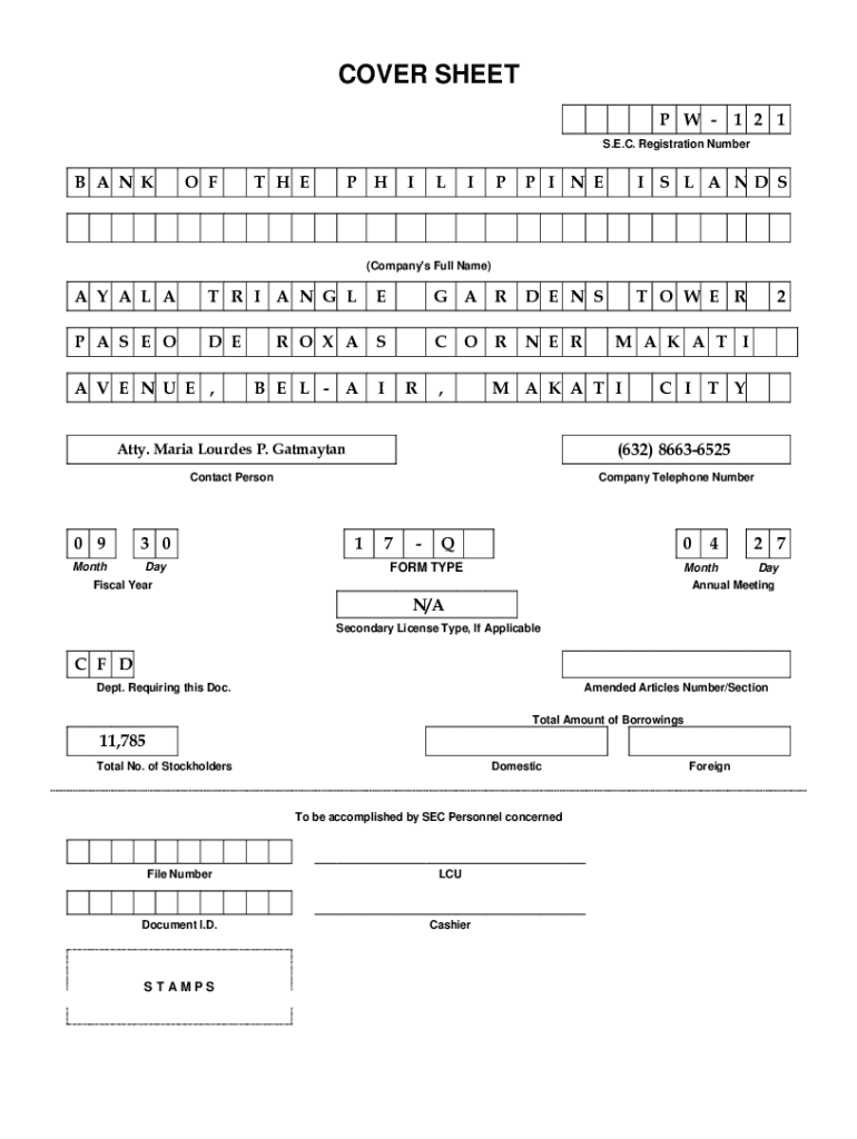 COVER SHEET P W 1 2 1S.E.C. Registration NumberB A N KO FT H EPHILIPP I N EI S L A ND ST O W E R(Company\'s Full Name)A Y A L AT R I A N G LEG ARD E N SP A S E OD ER O X ASC ORN E RB E L AI,M A K