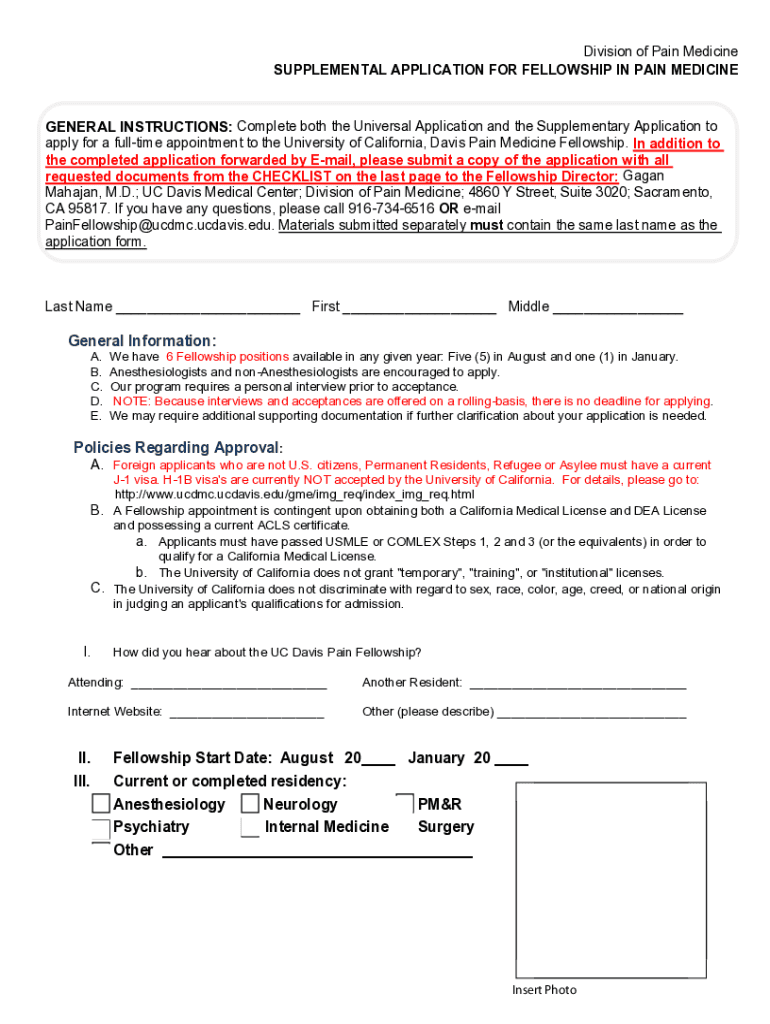 Division of Pain Medicine SUPPLEMENTAL APPLICATION FOR FELLOWSHIP IN PAIN MEDICINEGENERAL INSTRUCTIONS: Complete both the Universal Application and the Supplementary Application to apply for a fulltime