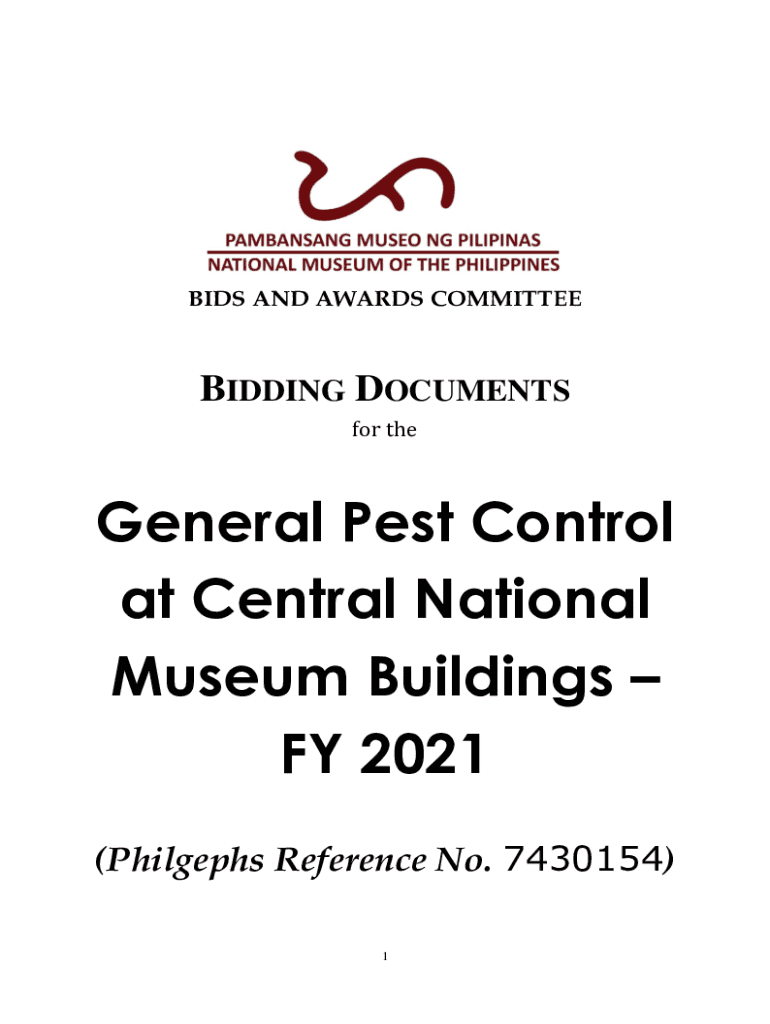 BIDS AND AWARDS COMMITTEEBIDDING DOCUMENTS for theGeneral Pest Control at Central National Museum Buildings FY 2021 (Philgephs Reference No. 7430154) 1TABLE OF CONTENTS Section I.Invitation to BidSection