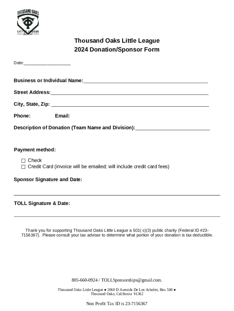 The 2024 Donation/Sponsor is a document that should be submitted to the specific address to provide certain information. It needs to be completed and signed, which can be done manually in hard copy, or via a certain solution like PDFfiller. It lets you fill out any PDF or Word document directly from your browser (no software requred), customize it according to your requirements and put a legally-binding electronic signature. Right after completion, you can send the 2024 Donation/Sponsor to the relevant individual, or multiple individuals via email or fax. The editable template is printable too thanks to PDFfiller feature and options offered for printing out adjustment. In both digital and in hard copy, your form should have a clean and professional outlook. You can also turn it into a template to use it later, so you don't need to create a new blank form over and over. Just amend the ready form.
