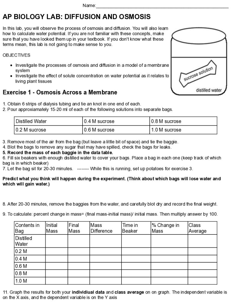 Name:___AP BIOLOGY LAB: DIFFUSION AND OSMOSIS In this lab, you will observe the process of osmosis and diffusion. You will also learn how to calculate water potential. If you are not familiar with