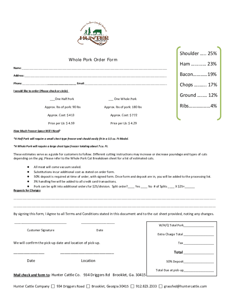 Shoulder .. 25% Whole Pork Order Form Name:___Ham ...... 23%Address:___Bacon19%Phone:___ Email:___Chops .... 17%I would like to order (Please check or circle)____One Half Pork___ One Whole PorkApprox.