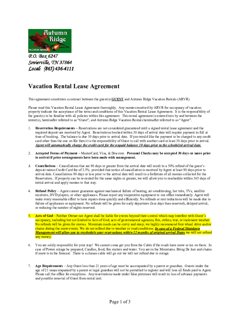 P.O. Box 6247 Sevierville, TN 37864 Local: (865) 4364364111Vacation Rental Lease Agreement This agreement constitutes a contract between the guest(s) GUEST and Autumn Ridge Vacation Rentals (ARVR).