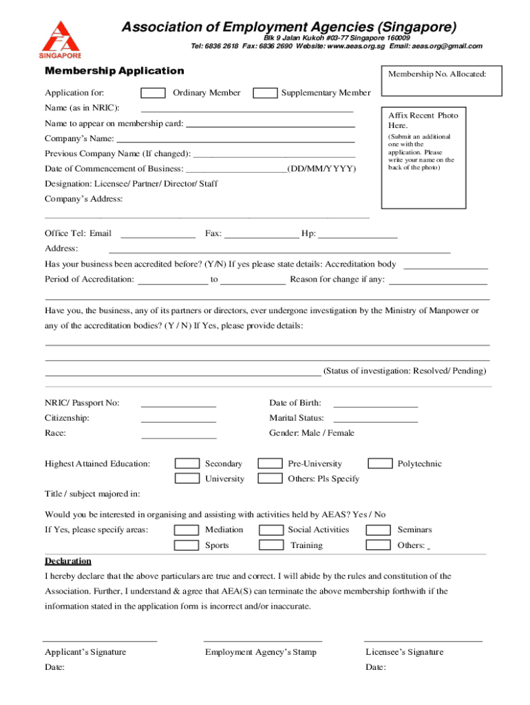 Association of Employment Agencies (Singapore) Blk 9 Jalan Kukoh #0377 Singapore 160009 Tel: 6836 2618 Fax: 6836 2690 Website: www.aeas.org.sg Email: aeas.org@gmail.comMembership Application Application