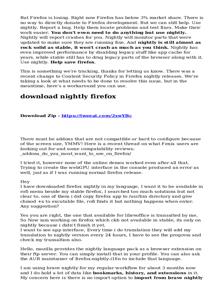 But Firefox is losing. Right now Firefox has below 3% market share. There is no way to directly donate to Firefox development. But we can still help. Use nightly. Report a bug. Help them locate problems