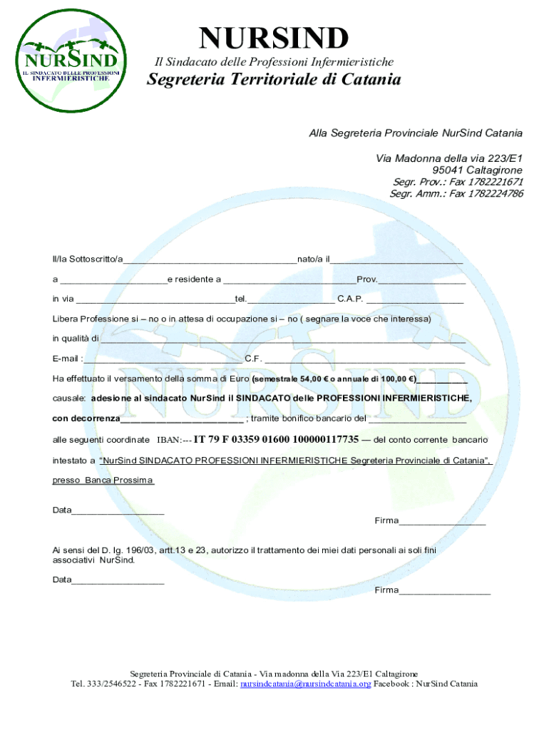 NURSINDIl Sindacato delle Professioni InfermieristicheSegreteria Territoriale di Catania Alla Segreteria Provinciale NurSind Catania Via Madonna della via 223/E1 95041 Caltagirone Segr. Prov.: Fax