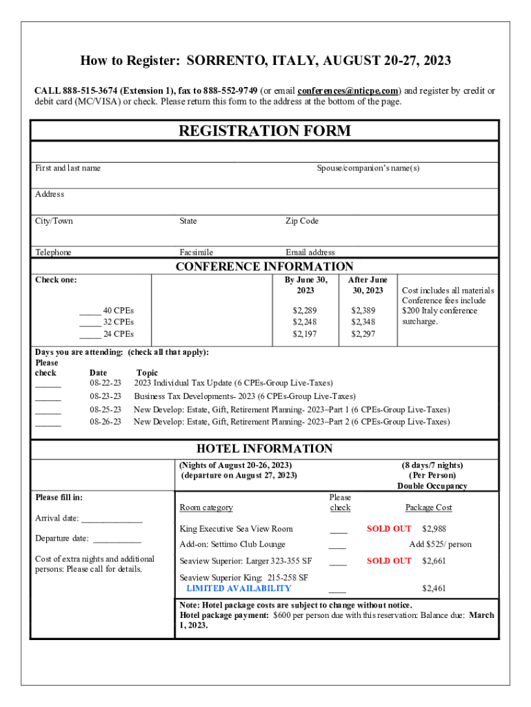 How to Register: SORRENTO, ITALY, AUGUST 2027, 2023 CALL 8885153674 (Extension 1), fax to 8885529749 (or email conferences@nticpe.com) and register by credit or debit card (MC/VISA) or check. Please