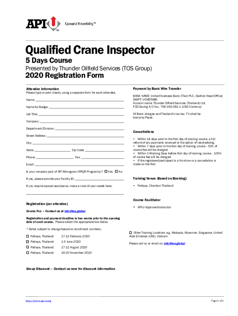 Qualified Crane Inspector 5 Days CoursePresented by Thunder Oilfield Services (TOS Group)2020 Registration FormPayment by Bank Wire TransferAttendee Information Please type or print clearly, using