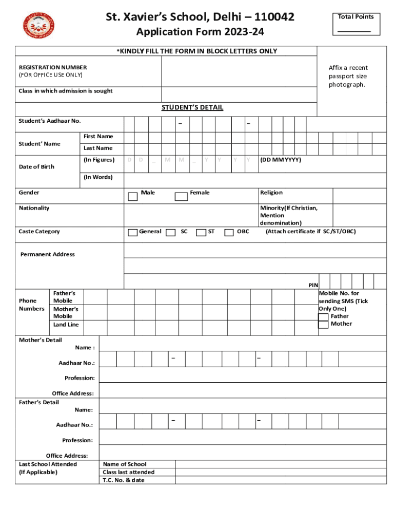 St. Xaviers School, Delhi 110042Total PointsApplication Form 2023 202324 *KINDLY FILL THE FORM IN BLOCK LETTERS ONLYAffix a recent passport size photograph.REGISTRATION NUMBER (FOR OFFICE USE ONLY)