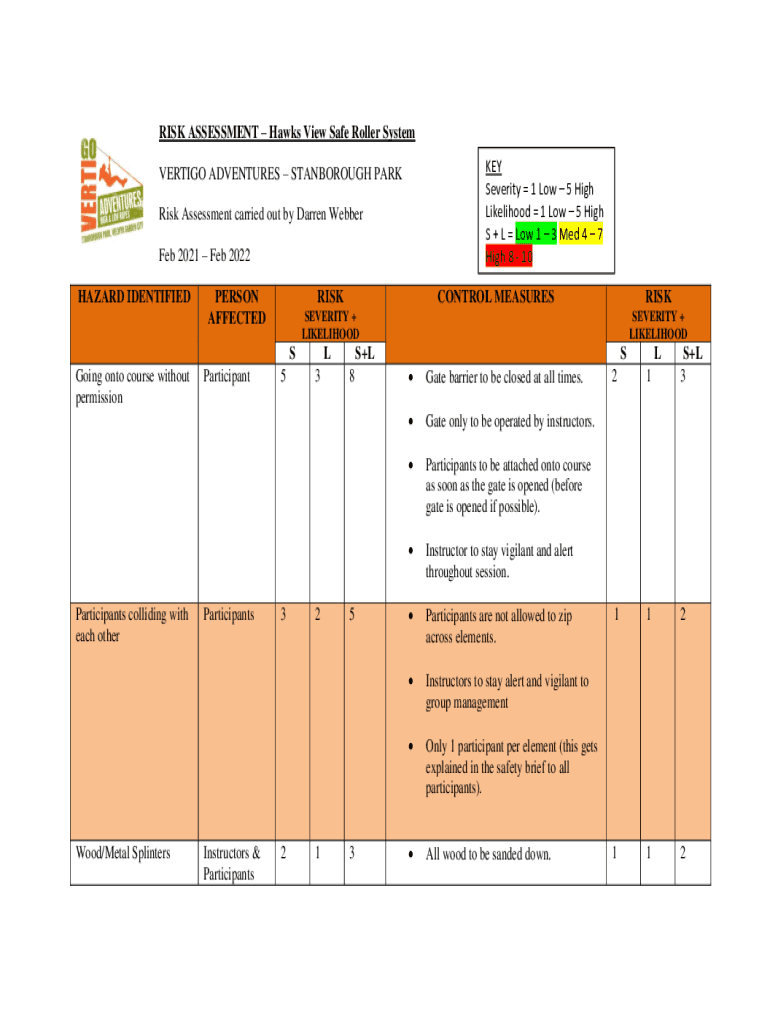 RISK ASSESSMENT Hawks View Safe Roller System KEY Severity 1 Low 5 High Likelihood 1 Low 5 High S + L Low 1 3 Med 4 7 High 8 10VERTIGO ADVENTURES STANBOROUGH PARK Risk Assessment carried out by Darren