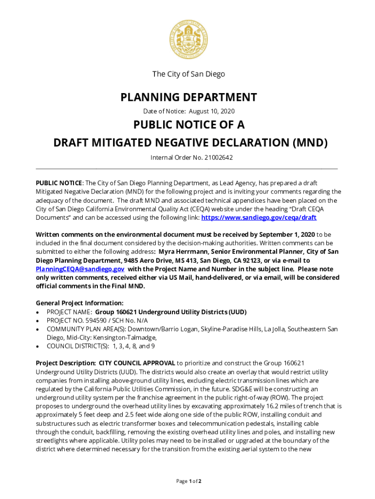 The City of San DiegoPLANNING DEPARTMENT Date of Notice: August 10, 2020PUBLIC NOTICE OF A DRAFT MITIGATED NEGATIVE DECLARATION (MND) Internal Order No. 21002642 ___ PUBLIC NOTICE: The City of San