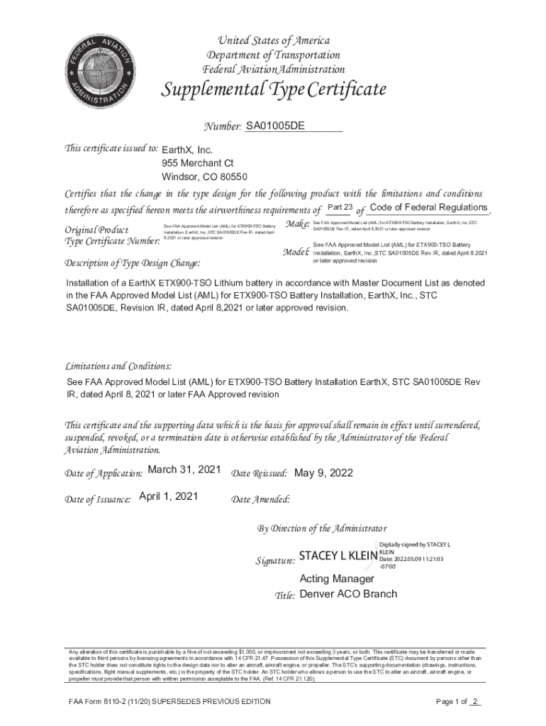 United States of America Department of Transportation Federal Aviation AdministrationSupplemental Type Certificate SA01005DE Number: ___ This certificate issued to: EarthX, Inc. 955 Merchant Ct Windsor,