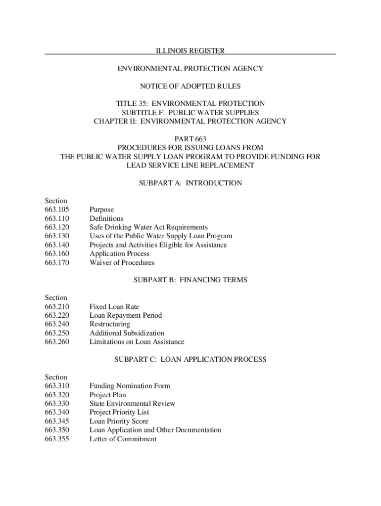 ILLINOIS REGISTER ENVIRONMENTAL PROTECTION AGENCY NOTICE OF ADOPTED RULES TITLE 35: ENVIRONMENTAL PROTECTION SUBTITLE F: PUBLIC WATER SUPPLIES CHAPTER II: ENVIRONMENTAL PROTECTION AGENCY PART 663