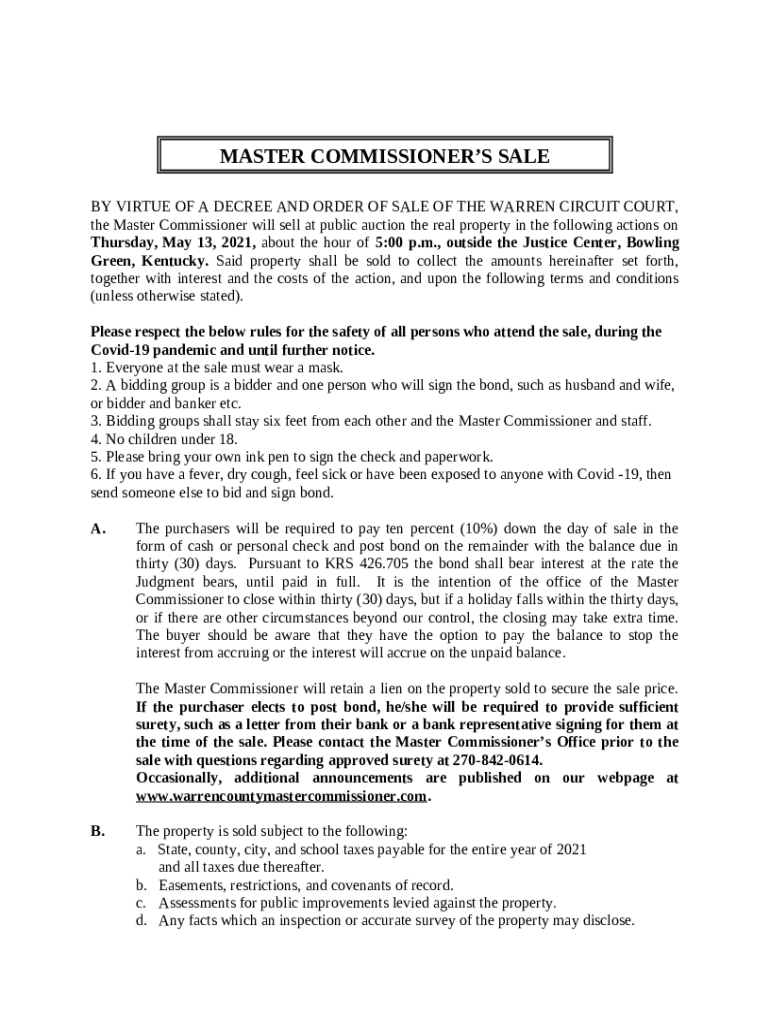 Instructions for the BY VIRTUE OF A DECREE AND ORDER OF SALE OF THE WARREN CIRCUIT COURT, the Master Commissioner will sell at public auction the real property in the following actions on Thursday, May 13, 2021, about the hour of 5:00 p form