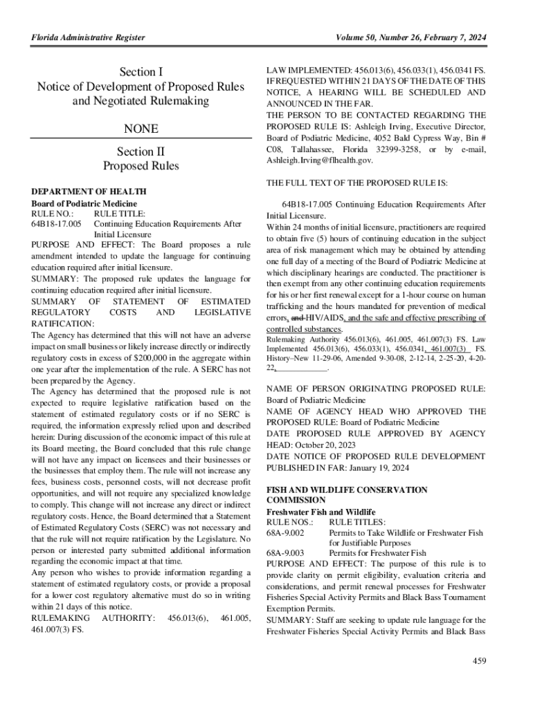 Proposed Multivolume 50, Number 26, February 7, 2024LAW IMPLEMENTED: 456.013(6),
