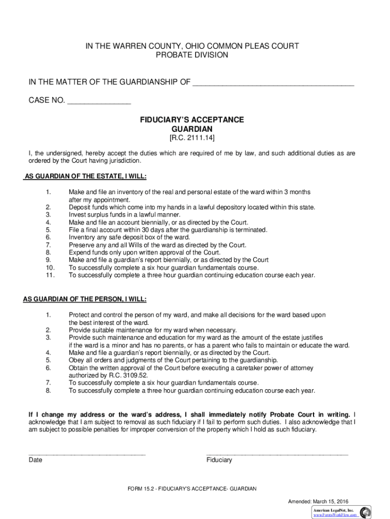 IN THE WARREN COUNTY, OHIO COMMON PLEAS COURT PROBATE DIVISIONIN THE MATTER OF THE GUARDIANSHIP OF ___ CASE NO. ___ FIDUCIARYS ACCEPTANCE GUARDIAN [R.C. 2111.14] I, the undersigned, hereby accept