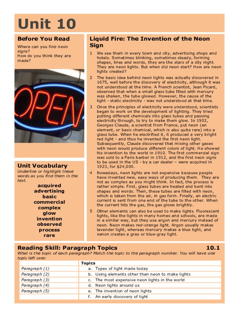 Unit 10 Before You Read Where can you find neon signs? How do you think they are made?Liquid Fire: The Invention of the Neon Sign 1We see them in every town and city, advertising shops and hotels.