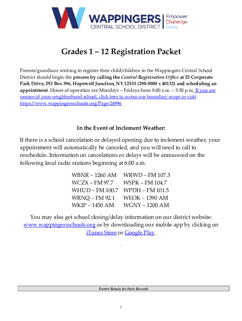 Grades 1 12 Registration Packet Parents/guardians wishing to register their child/children in the Wappingers Central School District should begin the process by calling the Central Registration Office