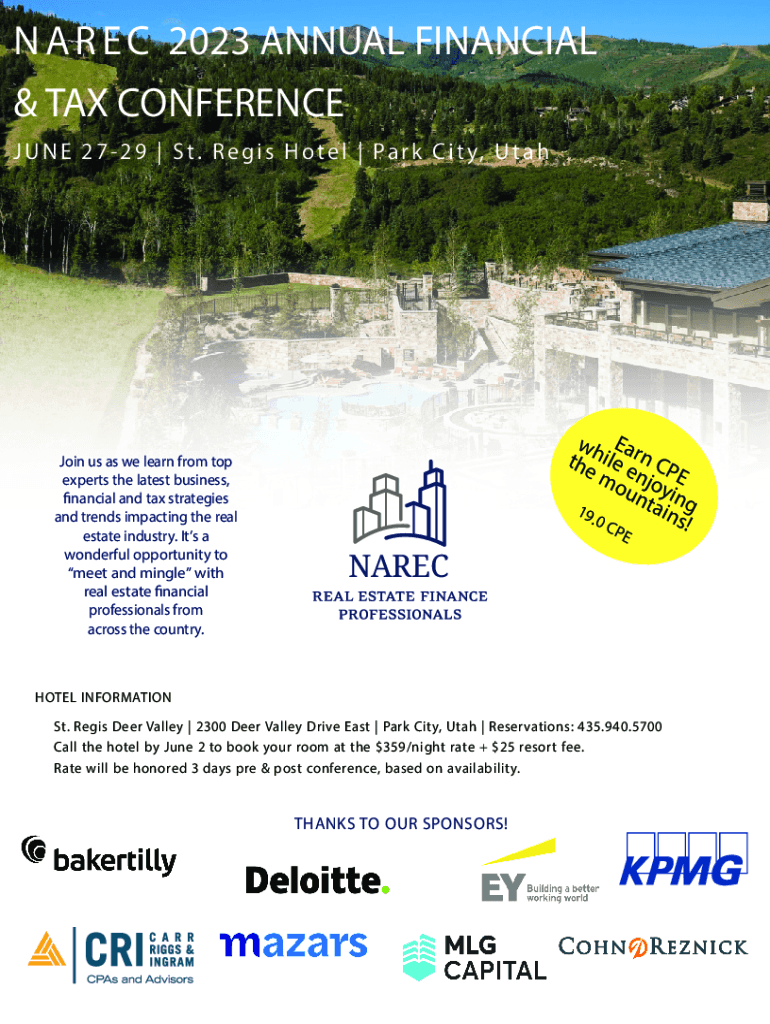 N A R E C 2023 ANNUAL FINANCIAL & TAX CONFERENCE J U N E 2 7 2 9 | S t . R e g i s H o t e l | Pa r k C i t y, U t a hJoin us as we learn from top experts the latest business, financial and tax strategies