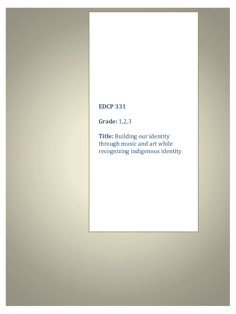 EDCP 331 Grade: 1,2,3 Title: Building our identity through music and art while recognizing indigenous identity and knowledgePlan Project A Design for Inquiry_Grade 1,2,3 Class Description: The two