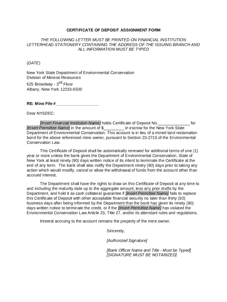 Instructions for the Certificate of Deposit Assignment - New York State form