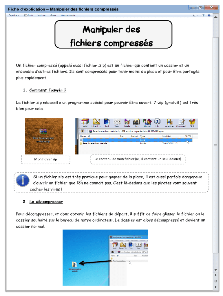 Fiche dexplication Manipuler des fichiers compresssManipuler des fichiers compresss Un fichier compress (appel aussi fichier .zip) est un fichier qui contient un dossier et un ensemble dautres fichiers.