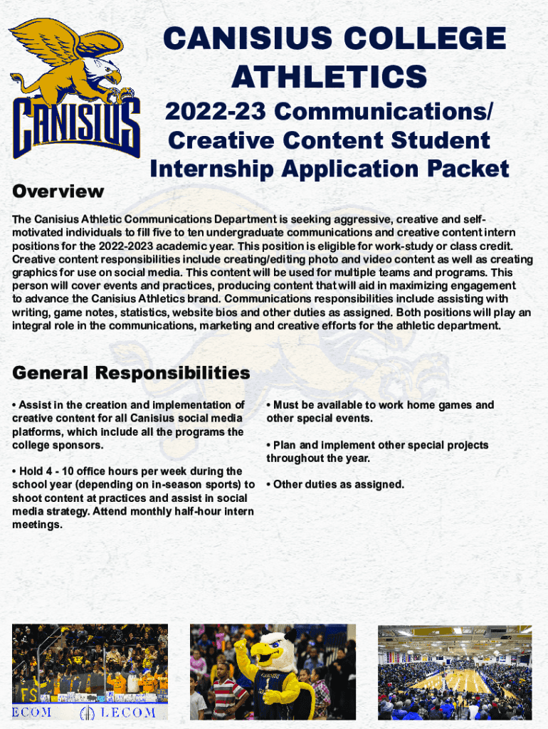 CANISIUS COLLEGE ATHLETICSOverview202223 Communications/ Creative Content Student Internship Application PacketThe Canisius Athletic Communications Department is seeking aggressive, creative and selfmotivated